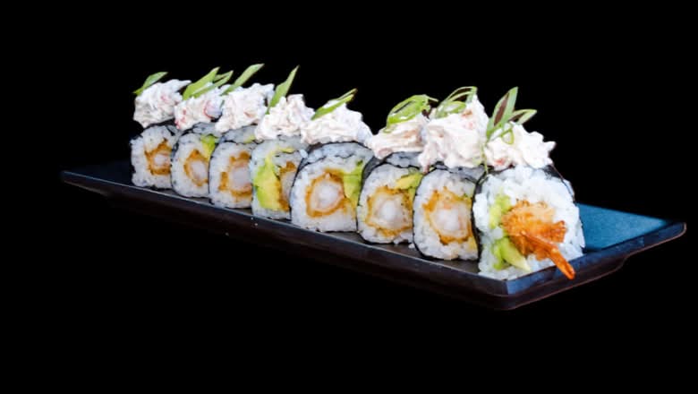 Crispy Tempura prawn and Avocado inside, Topped with crab & cream cheese, garnished with spring onions