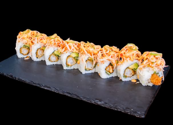 Crispy tempura prawns, cucumber and avocado inside, topped with shredded crab legs and garnished with spicy mayo and spring onions.